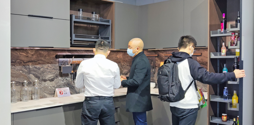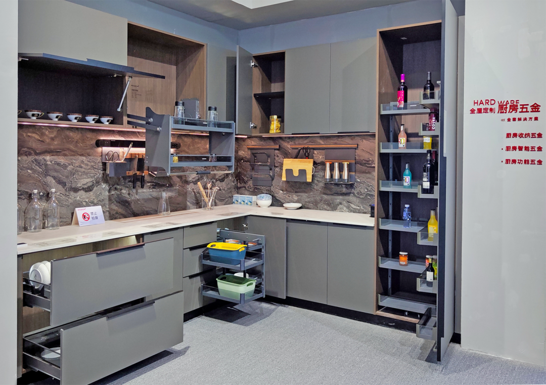 進入展館,映入眼簾的是廚房場景。吊柜升降籃,讓吊柜的利用率更高;碗碟籃、平籃、調味籃、側裝拉籃、轉角全開小怪物、高伸拉籃等廚房收納五金,不浪費櫥柜的每一分空間,發(fā)揮“小空間,大收納”的作用。