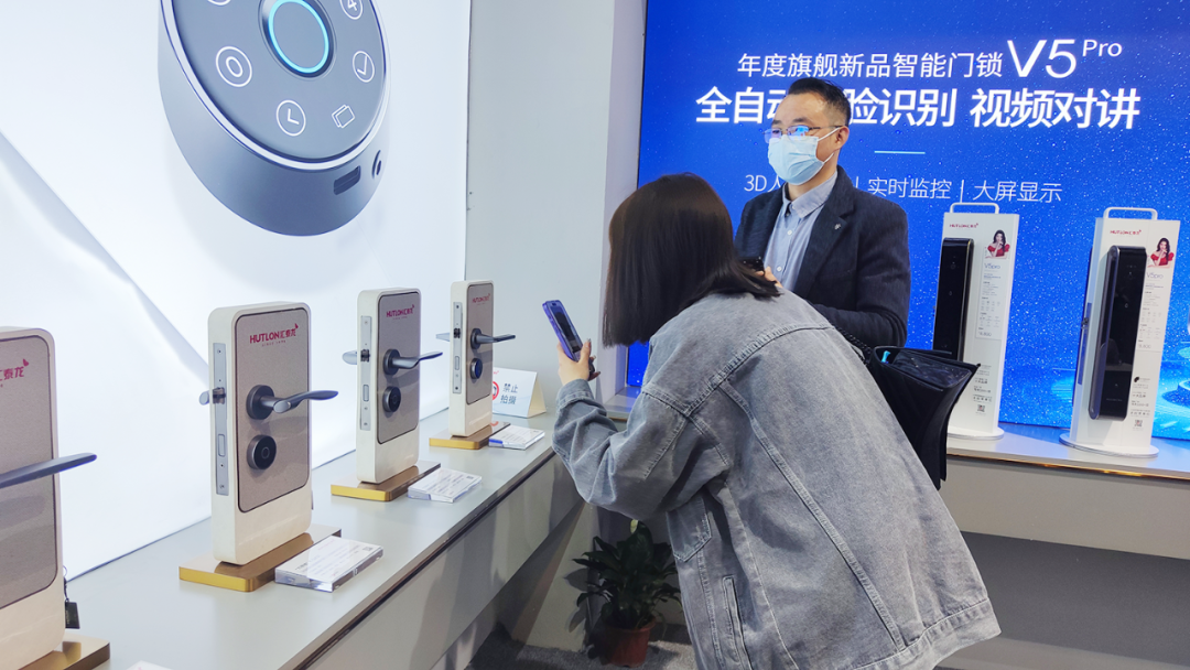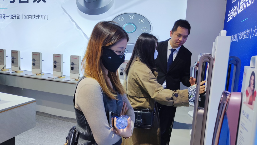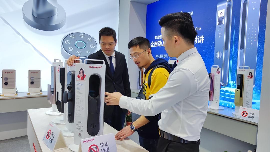 本次參展的V5pro、V3pro和D2pro三款智能門鎖新品兼具人臉識別與視頻功能,吸引客商們紛紛體驗:不用喚醒,靠近智能鎖即自動喚醒并識別,識別成功后,自動開鎖,關門自動上鎖??蜕谈傁囿w驗黑科技生活。