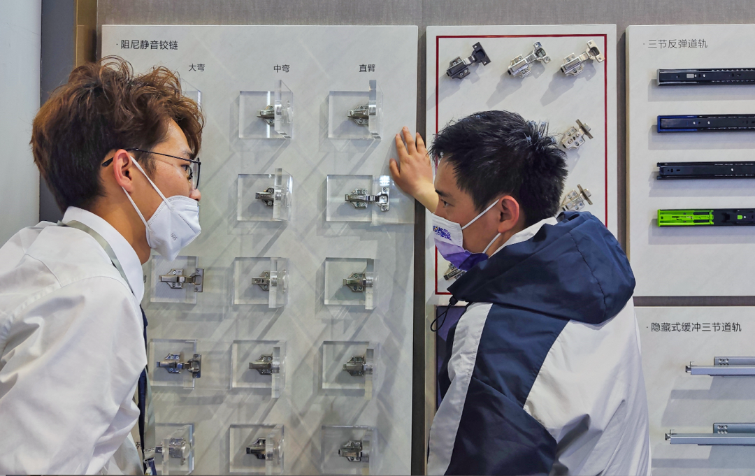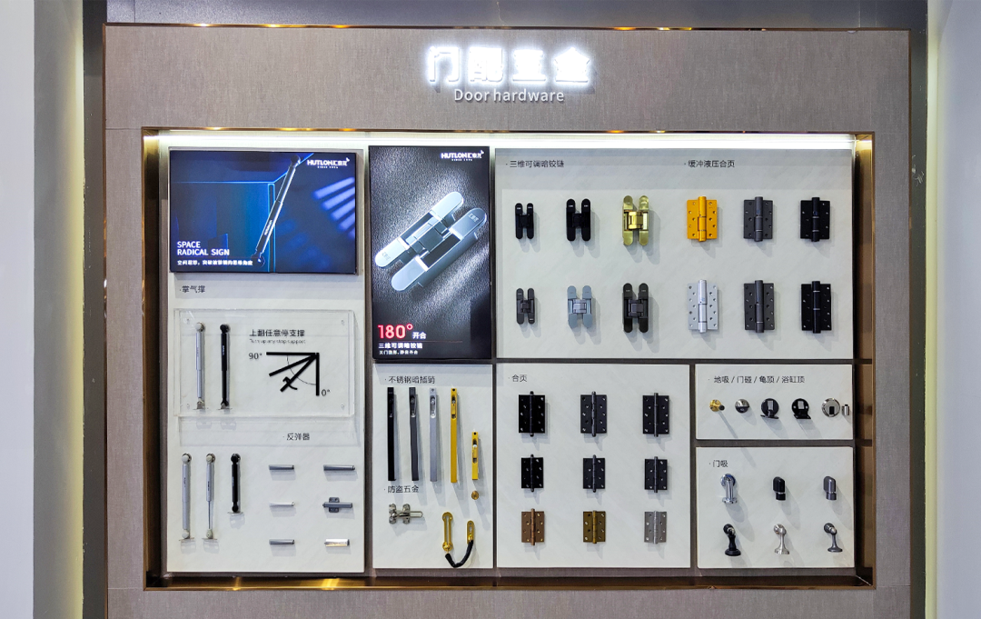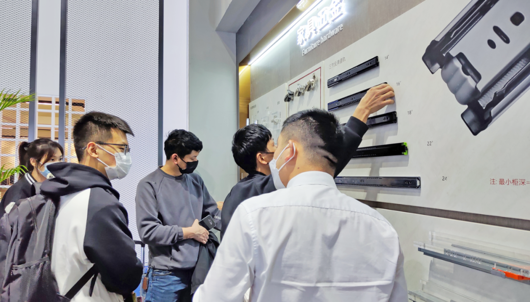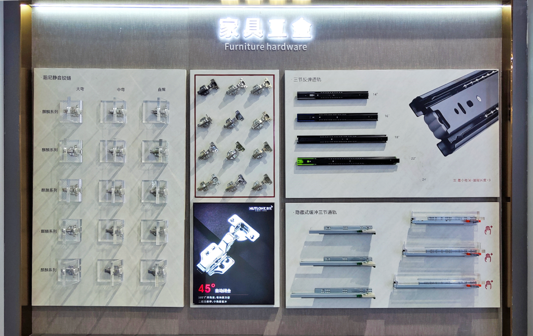 在家具五金展示專區(qū),門配移門五金攜手登場。分為墻面展示區(qū)、鉸鏈功能體驗和抽屜體驗四個部分,充分展示了緩沖鉸鏈、三節(jié)緩沖自閉道軌、三維可調暗鉸鏈、緩沖液壓合頁、銅合頁、門吸、地吸、反彈器、暗插銷、防盜扣、吊輪等五金產品。