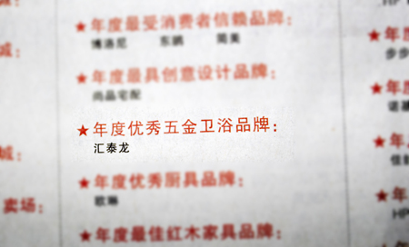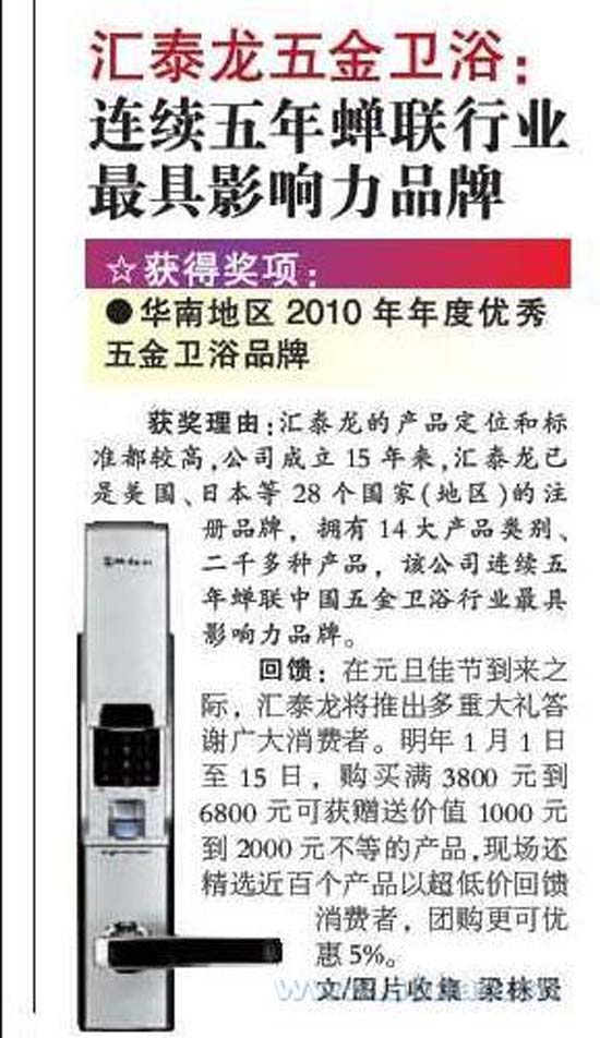 由羊城晚報《家居周刊》、《先鋒周刊》主辦的華南地區(qū)2010年家居/家電行業(yè)年度評選結果近日揭曉,匯泰龍品牌在此次評選活動中榮獲“年度優(yōu)秀五金衛(wèi)浴品牌”!獲獎結果已于《羊城晚報》2010年12月31日報刊中登出。