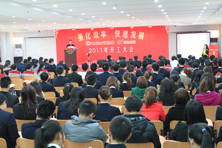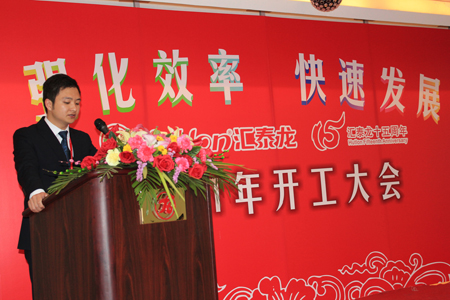 6點(diǎn)半,開(kāi)工大會(huì)準(zhǔn)時(shí)開(kāi)始,董事長(zhǎng)陳鴻填先生首先向公司全體員工及員工家人朋友表達(dá)了新年祝福!接著,陳董以“新起點(diǎn),新目標(biāo)”為主題,和大家共同回顧過(guò)去一年全公司所取得的成績(jī),共同檢討過(guò)去一年中的不足,闡述公司未來(lái)三年的主要發(fā)展規(guī)劃和思路。董事長(zhǎng)最后對(duì)2011年主題文化——效率年作了詳細(xì)的的詮釋,自此匯泰龍進(jìn)入“強(qiáng)化效率,快速發(fā)展”的效率年。