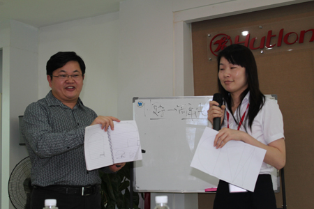 王老師在培訓(xùn)一開始首先針對“《人性化溝通》課程的十三條前提假設(shè)”和全體學(xué)員作了討論和分析,提出十三條改善和提升溝通技巧的黃金法則,同時(shí)采取游戲互動的方式檢測兩兩人小組之間的溝通效果,讓在場的所有學(xué)員從簡單的游戲中對平時(shí)工作的溝通難題迎刃而解。本次的溝通培訓(xùn)內(nèi)容涵蓋:上級與下級、同事之間、公司和經(jīng)銷商、跨部門之間、銷售人員與顧客的溝通方式,首先大家都提出了幾個(gè)比較典型的溝通案例,從討論和分析的角度,對溝通的心態(tài)和方式作了演練和分析,讓在場的學(xué)員受益頗多,有一部分參訓(xùn)學(xué)員在課后不無感慨地說“此次培訓(xùn)是一次改變一生的課”!