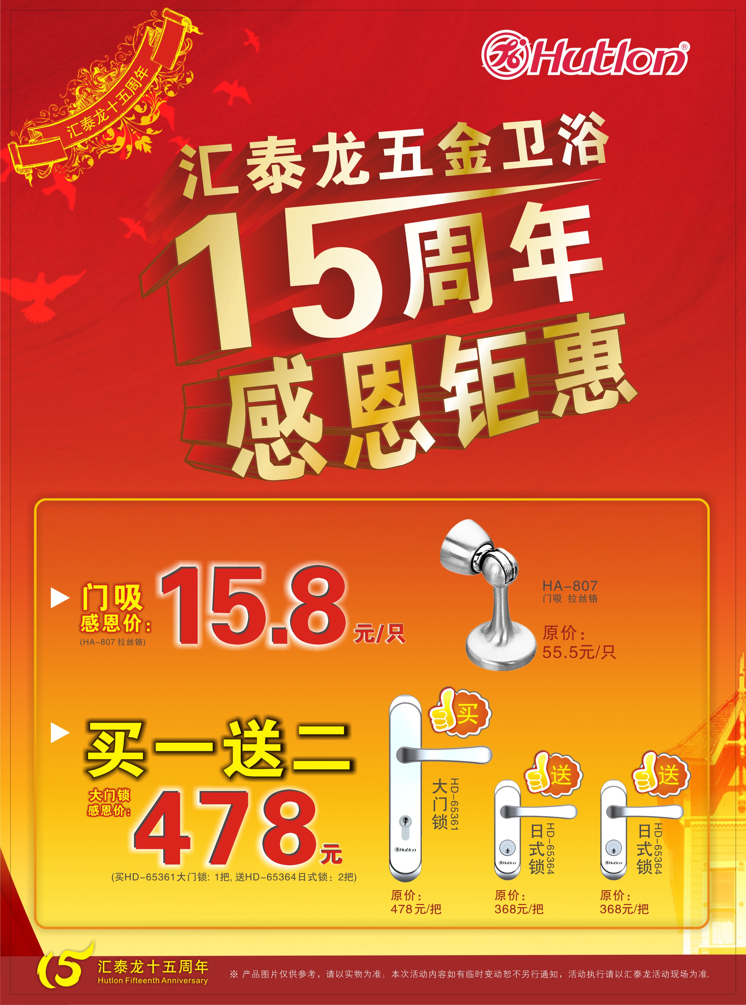 這是值得慶祝的一年,我們不會忘記一直以來給予匯泰龍支持與厚愛的廣大消費者,感恩與回饋消費者是我們這次活動的初衷。于此,我公司特推出“匯泰龍十五周年感恩鉅惠”主題促銷活動:
