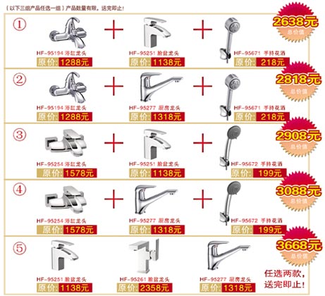 價(jià)值 218 元 HF-95671手持花灑一個(gè) (價(jià)值 1138 元 HF-95251臉盆龍頭或價(jià)值 1318 元 HF-95277廚房龍頭,二款選一)。