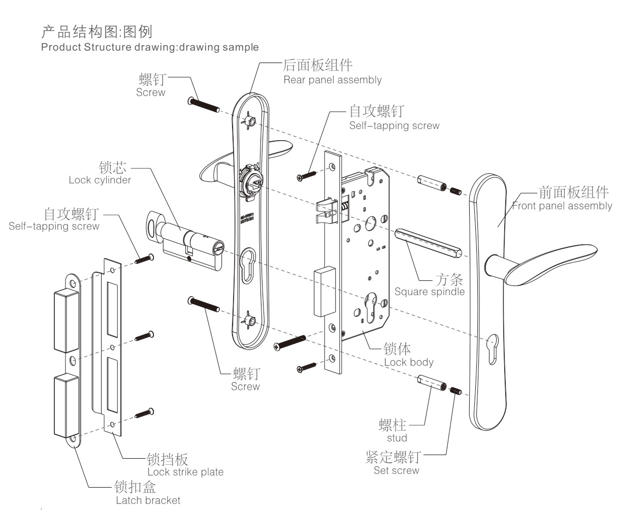 6擰緊螺釘,安裝扣板及扣盒,對(duì)齊鎖體,應(yīng)使鎖舌與之配合順暢,擰緊螺釘(如上圖:H)。